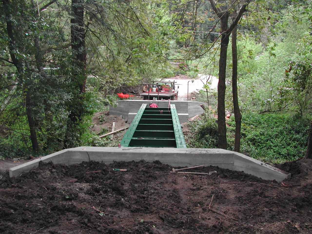 Avalon builds bridge abutments, usually using helical piers. In this photo, the abutments contain vertical helical piers and diagonal helical tiebacks.