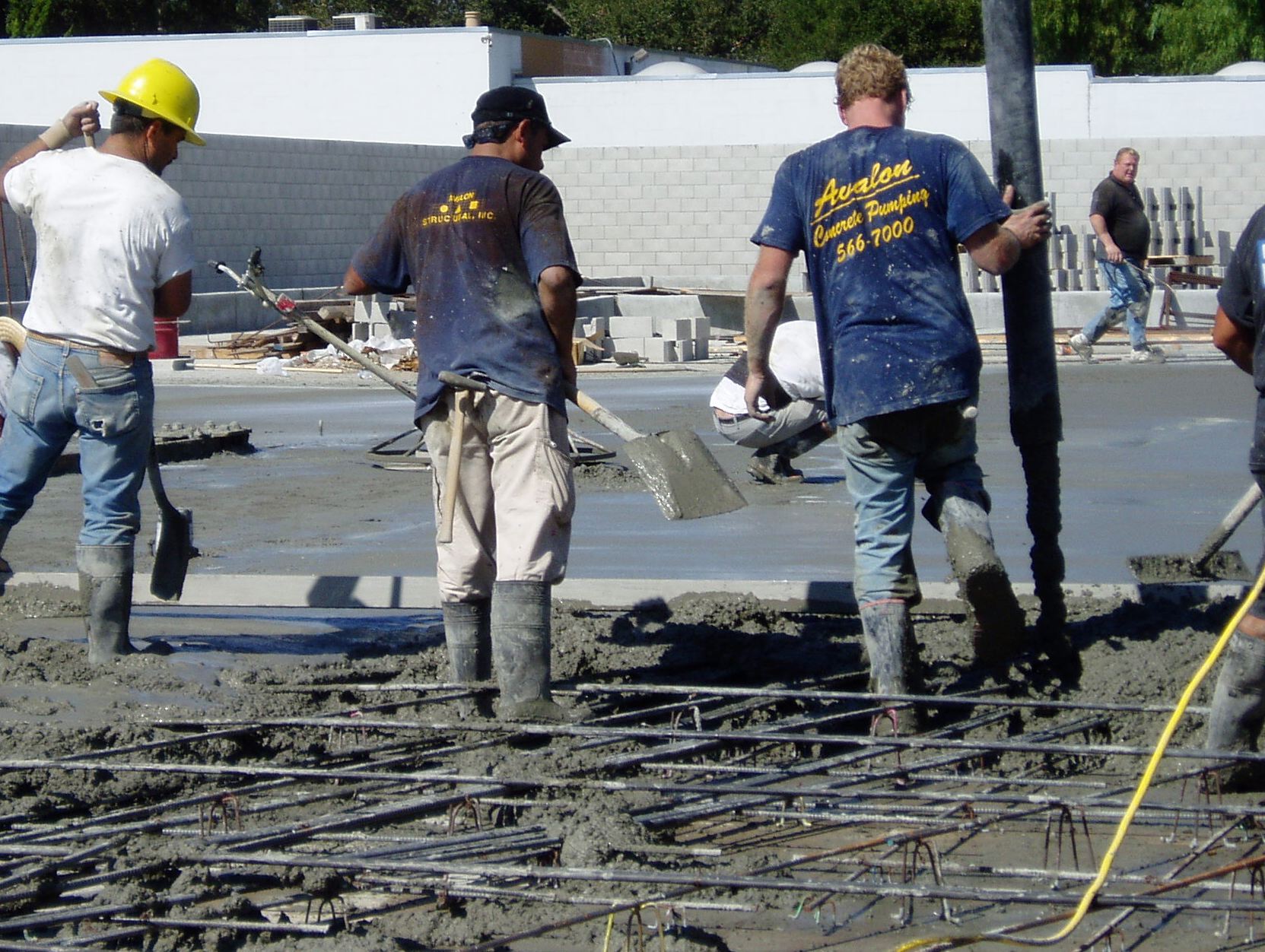 | Concrete being placed over post-tensioned cables and rebar.