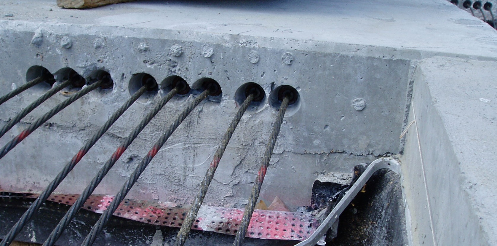 | Tendon (cable) tails after tensioning by Avalon. All cables pulled to 33,000 lbs, resulting in an 8" elongation in 100' of the 270 ksi cables.